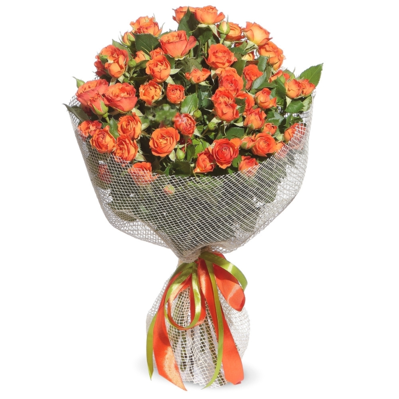 Букет состоит из 19 оранжевых кустовых роз, сетка, атласная лента.