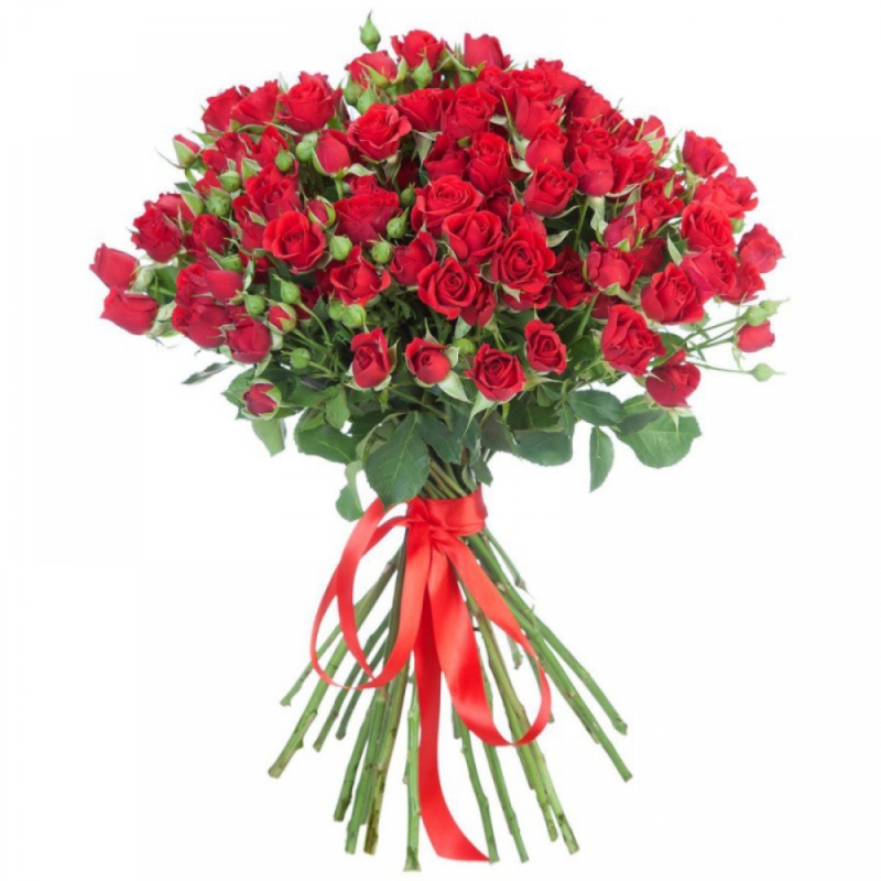 Букет состоит из 19 красных кустовых роз, прозрачная упаковка, атласная лента.