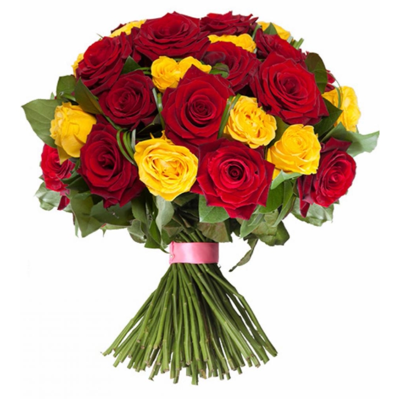 Букет состоит из 16 красных роз, 15 желтых роз, зелень, прозрачная упаковка, атласная лента.
